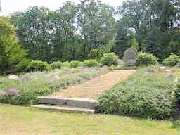 Auf dem Friedhof von Soderstorf: Die Ehrenanlage ist mit immergrünen Pflanzen bewachsen und steht auf einem Hügel.