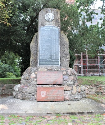In der Friedensstraße vor der Kirche: Ein zweistufiger Feldsteinsockel, darauf ein Findling mit Stele mit Namen Gefallener des Ersten Weltkrieges auf einer Tafel. Über der Tafel ein Stahlhelm mit Eichenlaub.
