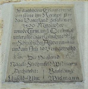 Über dem Eingang des Turms eine Inschrift vom Schwäbischen Albverein. Links daneben eine weitere Inschrift.