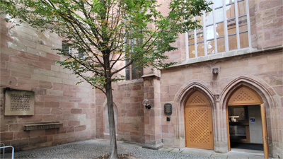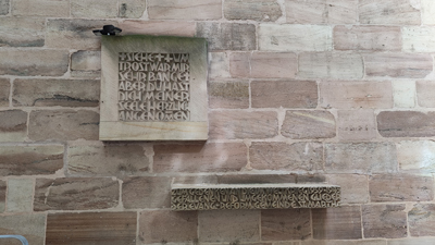 Gedenken ohne Namen im Vorhof der Evangelisch Reformierten Kirche St. Martha für die Gefallenen des 2. Weltkriegs.