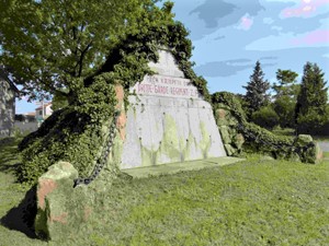 Die drei großen Metalltafeln an der Front des Denkmals sind heute leider verschwunden. Die Abdrücke