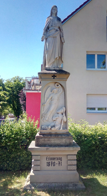 Obelisk mit Marienstatue auf Sockel mit Inschriften auf dem Friedhof. Rückseite und die rechte Seitenfläche mit einer Namensliste.
