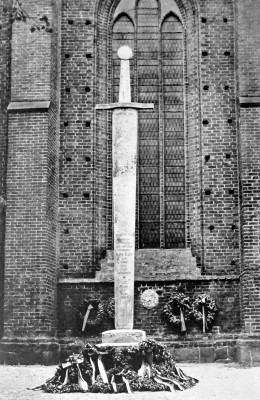 Ehemaliges Denkmal für die Gefallenen des Ersten Weltkriegs direkt an der Kirche: Kleiner Quader in dem ein überdimensioniertes Schwert steckt. Auf der Klinge war die Widmung eingraviert. Das Denkmal verschwand nach 1945.