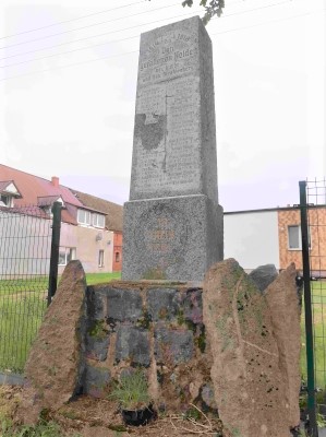 Denkmal für die Gefallenen des Ersten Weltkriegs am westlichen Ortseingang: Sockel aus Natursteinen mit aufgerichteter Granitplatte. Teile der Inschrift sind abgeplatzt.