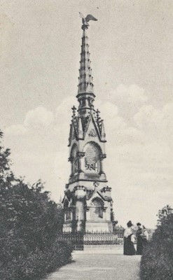 Ehemaliges Denkmal für die Stralsunder Gefallenen der Einigungskriege 1864, 1866 und 1870/71 an der Hospitaler Bastion: Reich verzierte, abgestufte Stele mit eingelassenen Feldern für Widmung und Namenstafeln. Auf der hohen schmalen Spitze thronte eine Adler-Figur. Das Denkmal wurde nach 1945 komplett abgerissen.