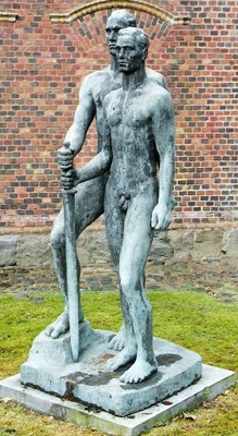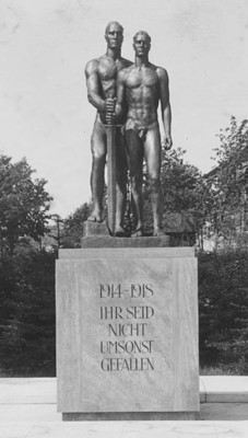 Ehemaliges Denkmal für die Gefallenen des Ersten Weltkriegs an der Sundpromenade: Quader mit Widmung, darauf Figuren von zwei nackten Kriegern, der Ältere reicht dem Jungen ein Schwert.