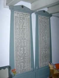 In der Heilgeistkirche vier wandhohe Gedenktafeln mit den Namen der 203 Kriegstoten des Ersten Weltkrieges