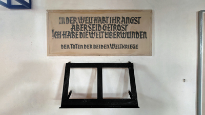 In der Kirche befindet sich eine Gedenktafel, darunter ein Gestell, das vermuten lässt, dass ursprünglich ein Buch hier auslag.