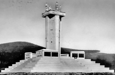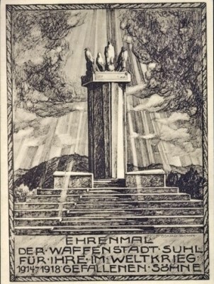 Ehemalige Denkmals-Anlage für die Gefallenen des Ersten Weltkriegs auf dem Hoheloh Berg: Großer sechsstufiger Sockel, darauf ein hoher Turm, gebildet aus vier riesigen nach unten ragenden Schwertern, die miteinander vermauert waren. Die vier Parierstangen der Schwerter bilden das Dach, auf dem als symbolischer Griff vier ruhende Adler saßen. Auf der obersten Sockelplatte waren Eckmauern errichtet, an denen Bronzetafeln mit den Namen der Gefallenen angebracht waren. Die Widmungen befanden sich in großen Buchstaben an einem Teil der Mauer. Am Turm waren die Jahreszahlen des Krieges angebracht. Das Denkmal stand noch bis 1983, ehe es abgerissen wurde. Die Namenstafeln sind erhalten.