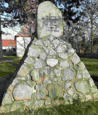 Denkmal für die Gefallenen des 1. Weltkriegs in Form einer Feldsteinpyramide mit aufgesetztem Findling. Die Namen sind in einzelnen Feldsteinen eingraviert.
