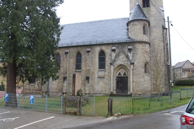 Eine einfache oben abgerundete Sandsteinstele, die auf der Vorder- und Rückseite glatt geschliffen wurde und die