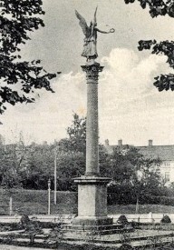 Denkmal für die Gefallenen des Krieges 1870/71 auf einem großen Platz: Niedrige Stele mit eingelassener Widmungs- und Namenstafel, darauf eine klassische Säule mit krönender Figur einer Siegesgöttin mit Lorbeerkranz in der Hand. Nach 1945 wurden die Säule und die Figur abgerissen und die Stele auf den Friedhof hinter dem Eingang versetzt.