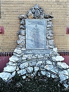 Von Steinen umrahmte Gedenkplatte an einem Gebäude, das