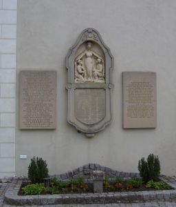 Oben in der Nische ist eine Frau mit knienden Soldaten dargestellt. Darunter stehen die Namen des 1. Weltkriegs beider Gemeinden.