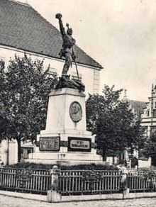 Ehemaliges Denkmal für die Gefallenen des Krieges 1870/71: Abgestufte Stele, darauf Soldatenfigur mit Fahne, einen Helm schwingend. Unten Widmung, Plakette der Kaiser und Reliefs.