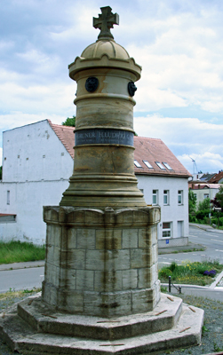 Nördlich der Ampelkreuzung an der Durchgangsstraße am Stadtteich steht auf einem kleinen Anhang auf achteckigem Unterbau eine Säule