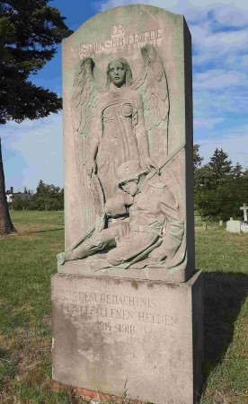 Denkmal für die Gefallenen des Ersten Weltkriegs: Aufgerichtete Sandsteinplatte mit großem Relief eines sterbenden Soldaten mit segnendem Engel (ohne Namen) auf dem Friedhof.