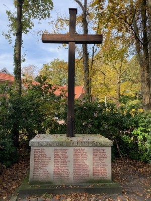 Großes Kreuz auf einem Sandsteinblock, am oberen Rand die umlaufende Inschrift, darunter die Namen in roter Schrift.
