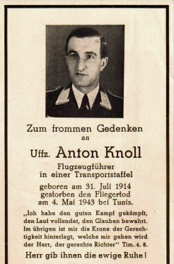 Unteroffizier Flugzeugführer | KNOLL | Anton | 31.07.1914 Hechingen | 04.05.1943 über Tunis |