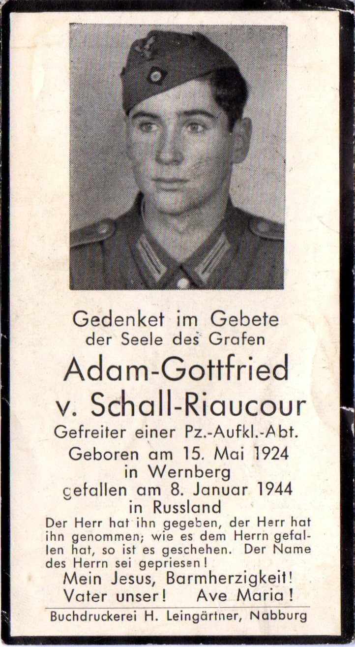 Gefreiter | SCHALL-RIAUCOUR | Adam-Gottfried Graf von | 15.05.1924 Wernberg | 08.01.1944 Russland bei Ssoloweika |