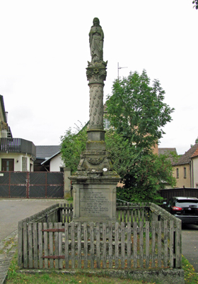 Inschriftensockel mit verzierter Rundsäule und darauf eine Marienfigur.