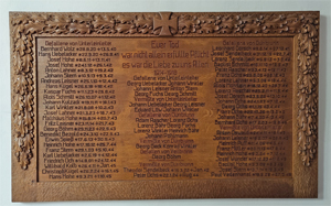 Hölzerne Gedenktafel in der katholischen Pfarrkirche St. Peter und Paul für die Orte Unterleinleiter, Dürrbrunn und Veilbronn.