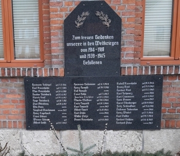 Im unteren Teil sind zunächst die Namen der Gefallenen des Ersten Weltkrieges und dann die des Zweiten Weltkrieges verzeichnet.