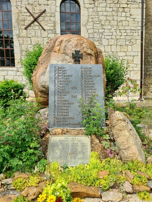 Davor lehnen an der Vorderseite am Fuß eine Namentafel für die Opfer des Ersten Weltkrieges