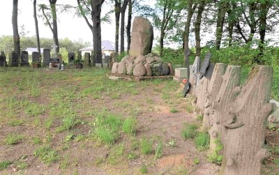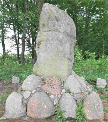 Denkmal für die Gefallenen des Ersten Weltkriegs auf dem örtlichen Friedhof in einem Lapidarium mit deutschen Grabsteinen: Feldsteinhaufen mit aufgerichtetem Findling mit eingravierter Widmung, Namen und EK-Zeichen mit Eichenlaub im oberen Bereich (fast nicht mehr lesbar).