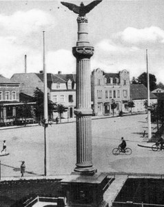 Ehemaliges Denkmal für die Gefallenen des Krieges 1870/71: Abgestufter und verzierter Quader mit aufgesetzter klassischer Säule und krönendem Adler.