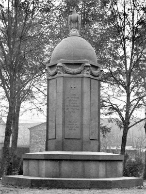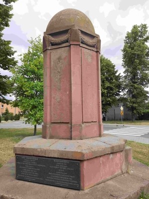Denkmal für die Gefallenen des Ersten Weltkriegs: Auf einem zweistufigen Sockel eine breite achteckige Stele aus rotem Sandstein mit eingelassenen Widmungs- und Namensflächen. Am oberen Rand Girlanden mit Soldatenköpfen an jeder Ecke. Auf dem runden Oberteil eine Adlerfigur.