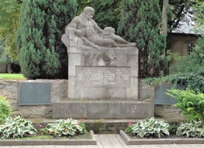 Denkmal für die Gefallenen des Ersten Weltkriegs: Aus Steinblöcken gemauerter abgestufter Quader mit Widmung vorn und Namen der Gefallenen auf der Rückseite, gekrönt von der Figur eines liegenden ruhenden Kriegers mit Stahlhelm und Gewehr. Nach der politischen Wende wurden an der Mauer rechts und links vom Denkmal Metalltafeln mit den Namen der Gefallenen des Zweiten Weltkriegs angebracht.