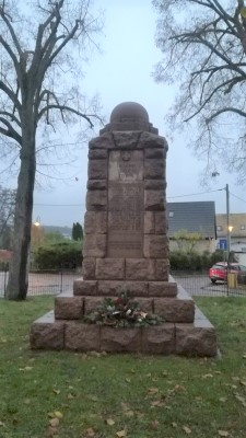 Porphyr-Denkmal im Ort, auf jeder Seite ein Eisernes Kreuz ausgehauen, auf der Vorderseite die Namen der Gefallenen des Ersten Weltkriegs.