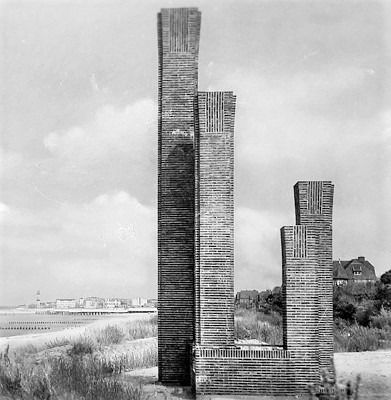 Ehemaliges Denkmal für die Gefallenen des Ersten Weltkriegs in den Dünen: Vier verschieden hohe viereckige Stelen aus Ziegelsteinen, die oben verbreitert waren. Die Namen waren unten in die Ziegel eingebrannt. Das Denkmal wurde schon 1938 abgerissen.