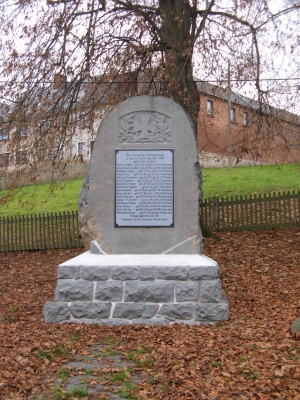 Denkmal in einer kleinen Anlage links am Weg von der B94 in Richtung Kirche: Steinquader mit einer beschrifteten Tafel.