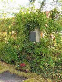 Denkmal rechts vor der Kirche: Ein Findling mit Gedenktafel und Eisernem Kreuz, stark mit Efeu bewachsen.