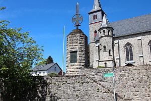 Achteckige Steinsäule aus bearbeiteten Natursteinen gemauert. Oben ein Schwert mit einem Eisernen Kreuz.