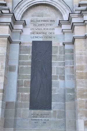 In einer Nische links vom Eingang der Abteikirche Metallplatte “Engel und Schlange” für das Infanterie-Regiment Nr. 124.