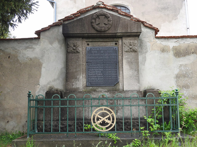 Denkmal an einer Außenmauer des Kirchhofs mit Namenstafel. Diese wurde auf die ursprüngliche Inschrift gesetzt.
