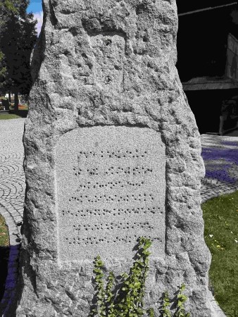 Denkmal für die Gefallenen des Ersten und Zweiten Weltkriegs: Zweistufiger Sockel mit aufgerichtetem Steinblock und krönendem EK-Zeichen.