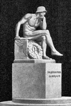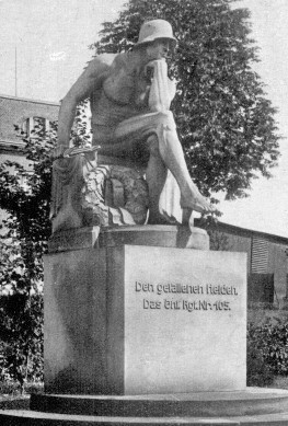 Ehemaliges Denkmal für die Gefallenen des sächsischen Infanterie-Regiments Nr. 105 auf dem Gedächtnisplatz: Quader mit der Widmung, darauf die Figur eines nackten sitzenden Kriegers mit Stahlhelm in nachdenklicher Pose und einem ruhenden Schwert in der Hand. Das Denkmal wurde nach 1945 abgerissen.