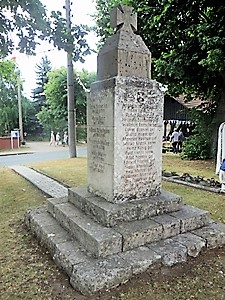 An zwei Seiten Namen der Opfer des Ersten Weltkrieges. An der Rückseite ein nach unter gerichtetes Schwert, das von Lorbeerlaub bekränzt ist.