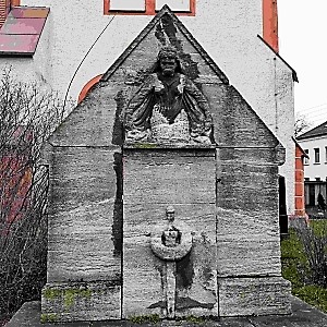 Sehr verwittertes Denkmal für die Gefallenen des 1. Weltkriegs vor der Kirche; aus Muschelkalk errichtet mit spitz zulaufendem Oberteil.