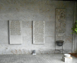 Rechts davon eine weitere Steintafel mit einem Relief, darunter die Inschrift der Gemeinde.