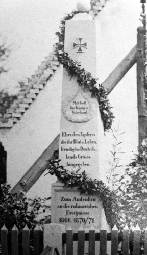 Abgestufter Obelisk mit Inschriften zum Gedenken an die Kriege 1866 und 1870/71 (nach 1945 abgerissen).
