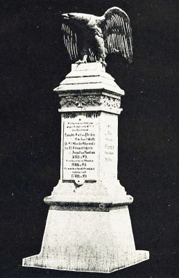Ehemaliges Denkmal für die Gefallenen des Füsilier-Regiments Nr. 90 im Krieg 1870/71: Abgestufte Stele mit Inschriften, Umrandung mit EK-Zeichen und Eichenlaub im oberen Bereich und krönendem Adler.