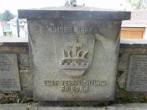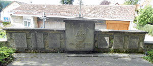 ein Kreuz, Wappen sowie die Inschrift, rechts Tafeln mit den Namen des 2. Weltkriegs.