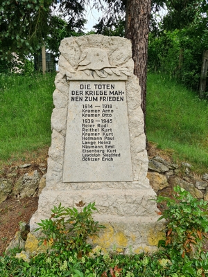 Auf dem Friedhof an der Ecke Wilhelm-Hauff-Weg/In der Hohle befindet sich ein Denkmal aus gemauertem Kalksandstein in Stelenform, grob behauen.