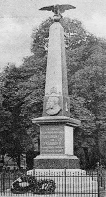 Denkmal für die Gefallenen des Krieges 1870/71: Abgestufter Obelisk mit krönendem Adler und Plakette mit dem Bildnis der Kaiser Wilhelm I. und Friedrich III.