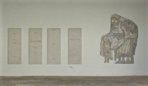 rechts daneben ein Relief Mutter mit Kind, aus bunten Mosaiksteinen zusammengestellt.